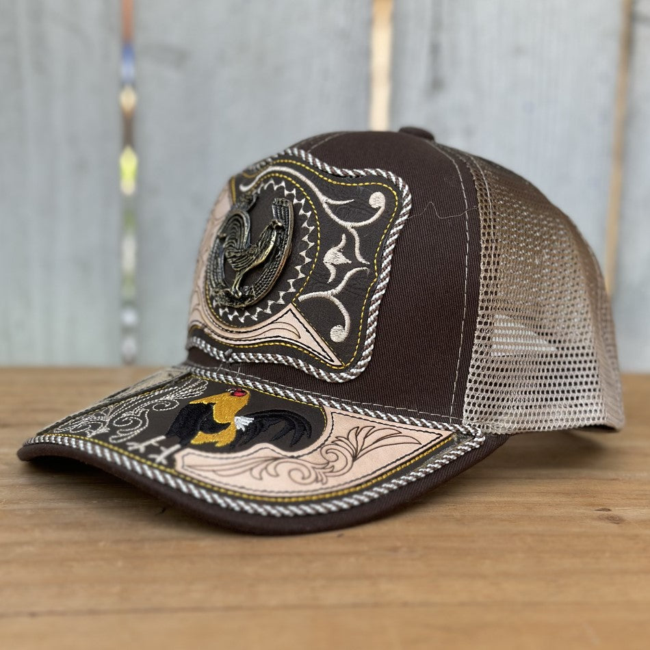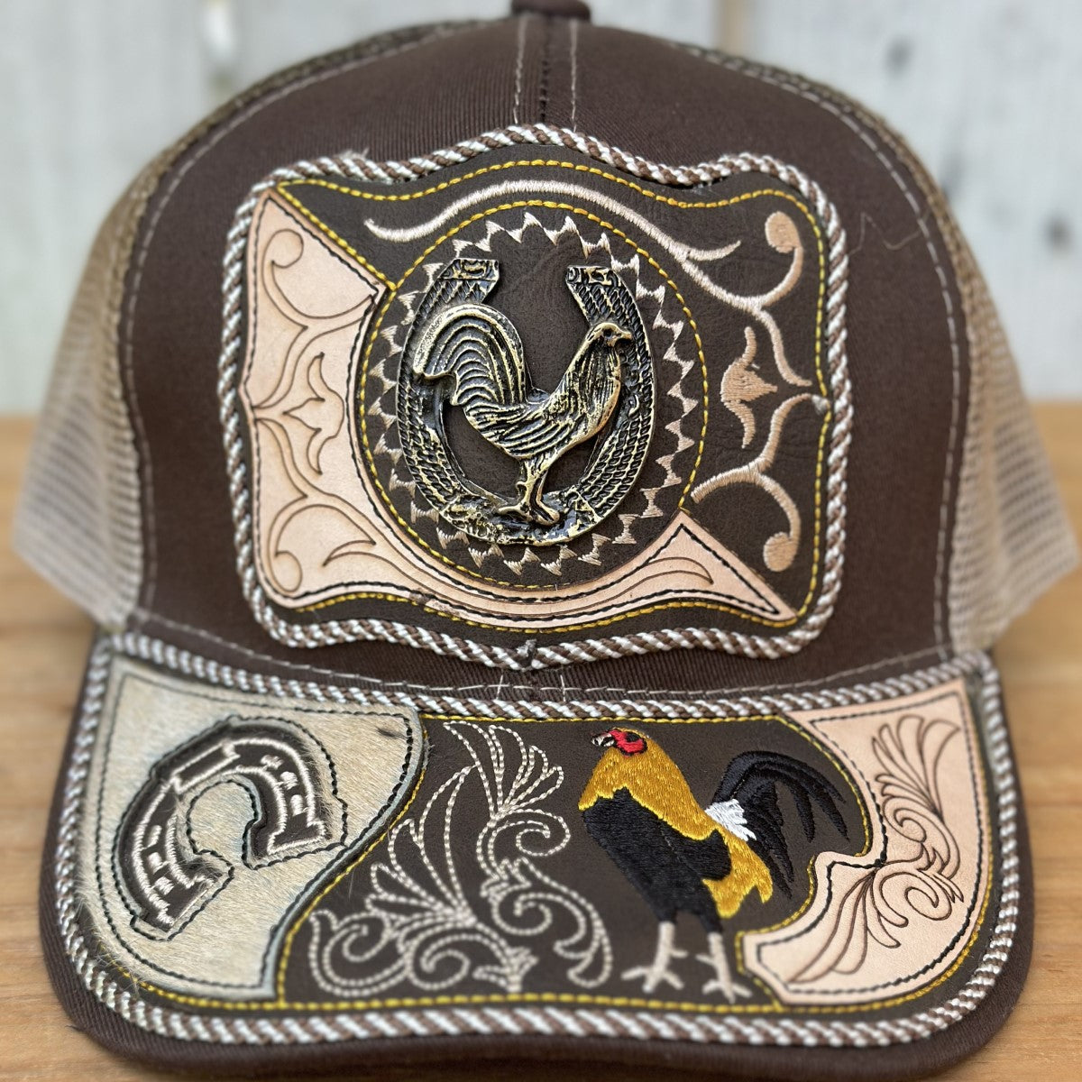 Gorra Vaquera Café con Gallo y Herradura - Gorras Artesanales Mexicanas