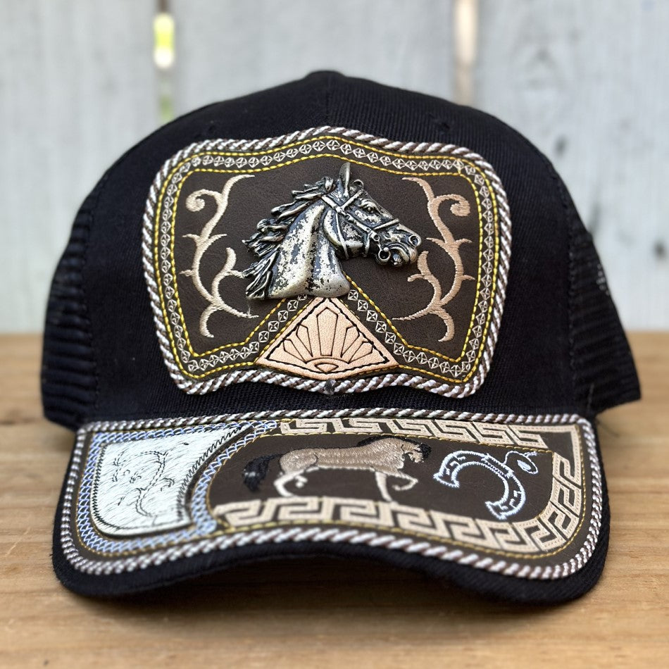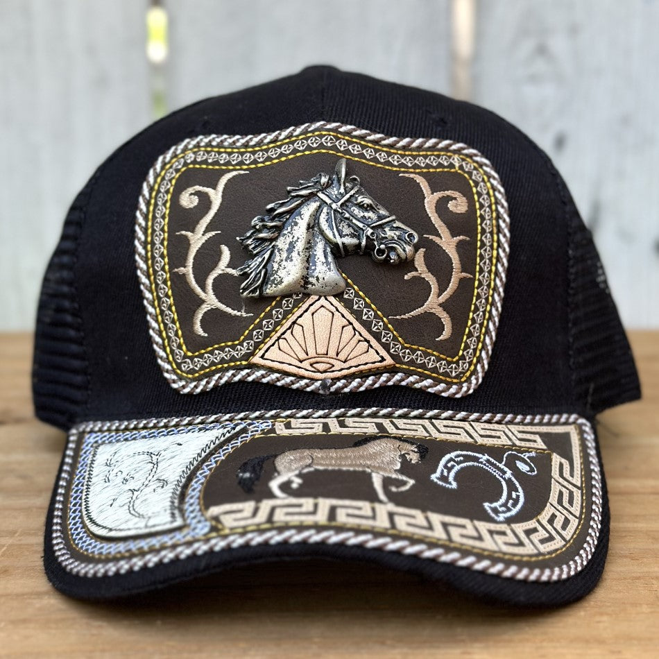 Gorra vaquera color negro con diseño de caballo. Hecha artesanalmente en México, cuenta con detalles hechos a mano y un caballo bordado en la visera. Esta gorra es única; es literalmente una de una.