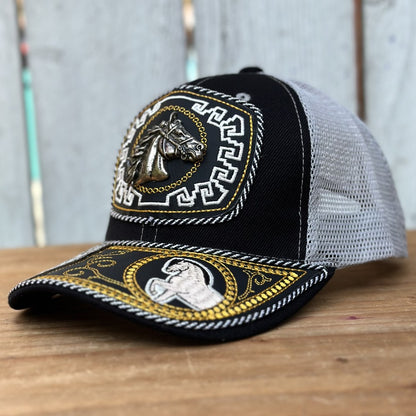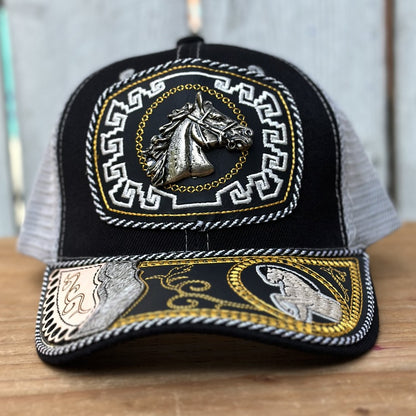 Gorra vaquera color negro con diseño de cabeza de caballo metálica rodeada de bordado dorado y blanco. Hecha artesanalmente en México, cuenta con detalles hechos a mano, pelo de res original y un caballo bordado en la visera con marco dorado. De este estilo solo existe una pieza; cada gorra es trabajada individualmente por artesanos, lo que la convierte en un modelo verdaderamente único y exclusivo.
