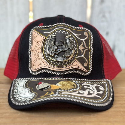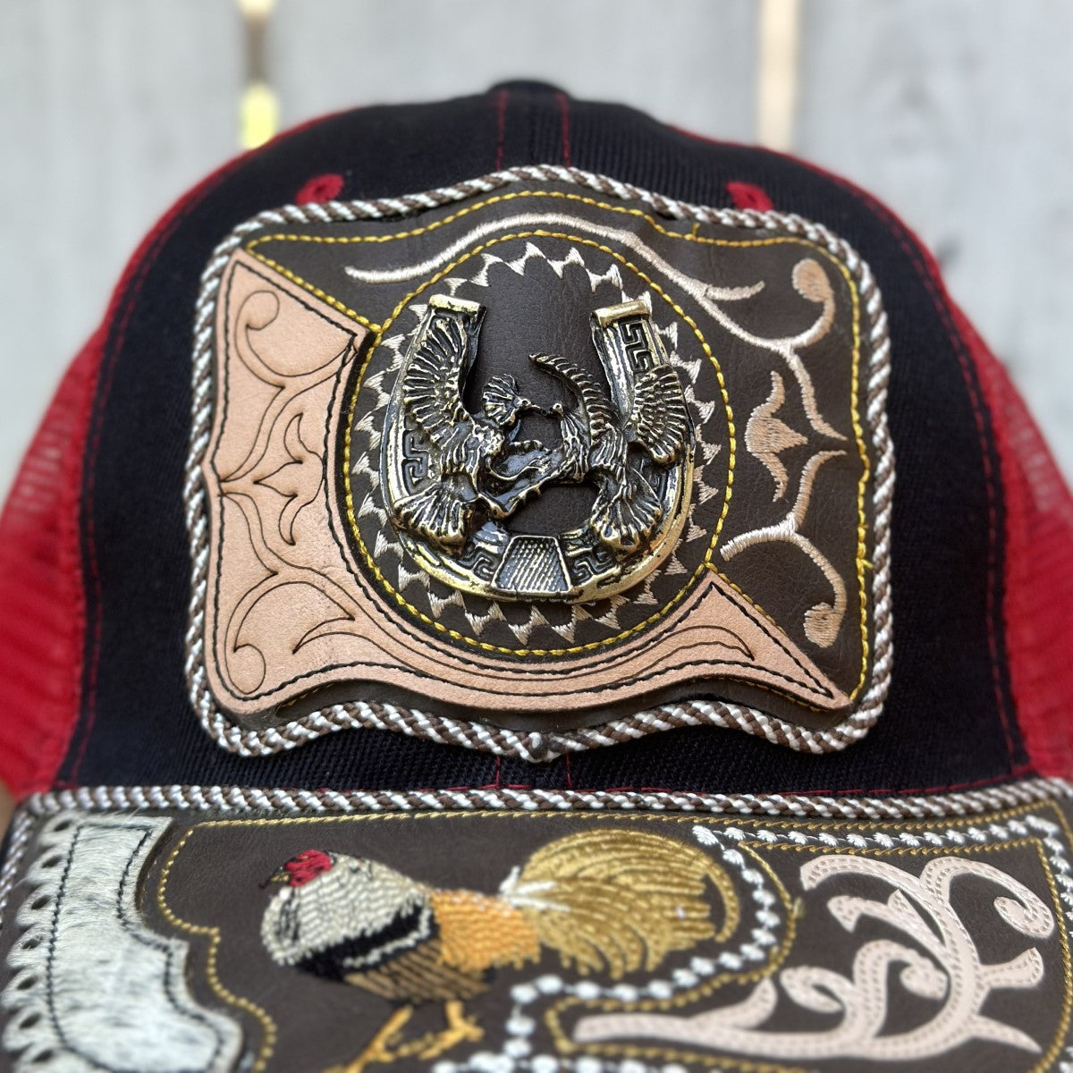 Gorra Vaquera Roja y Negra con Gallos y Herradura - Gorras Artesanales Mexicanas