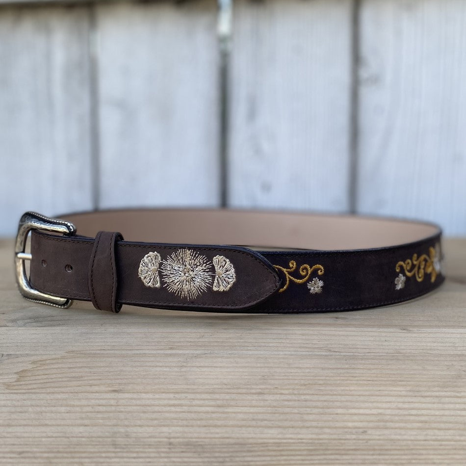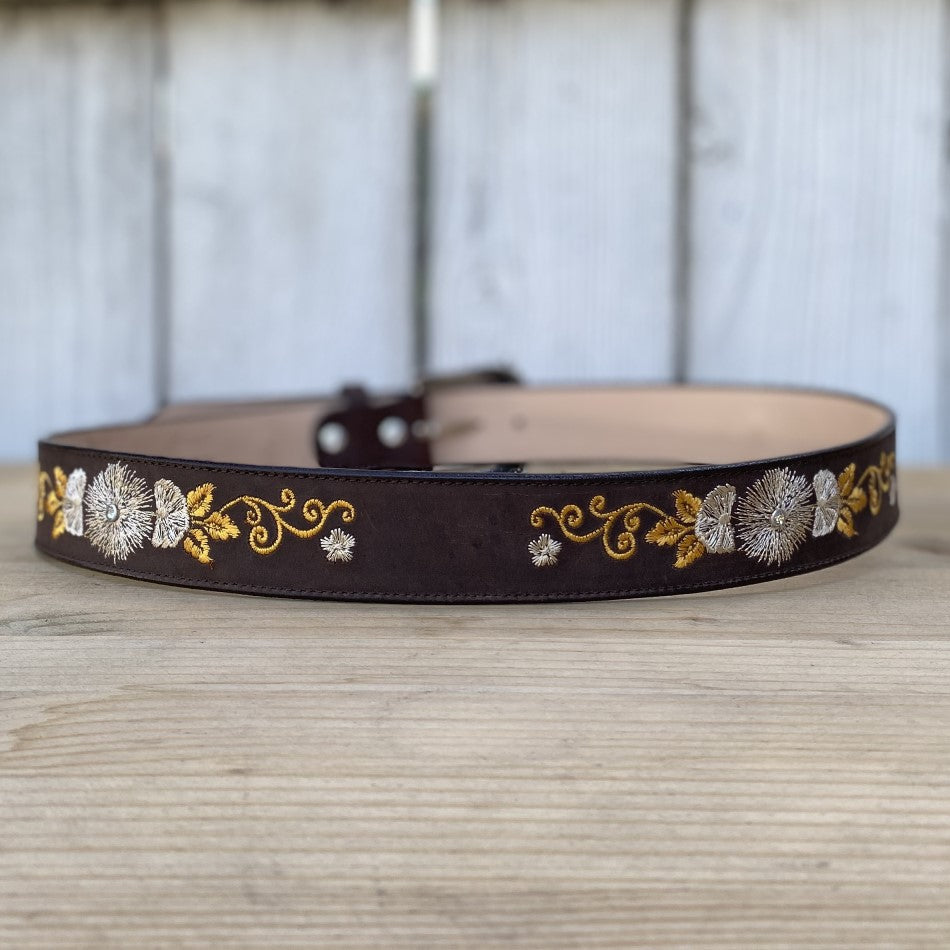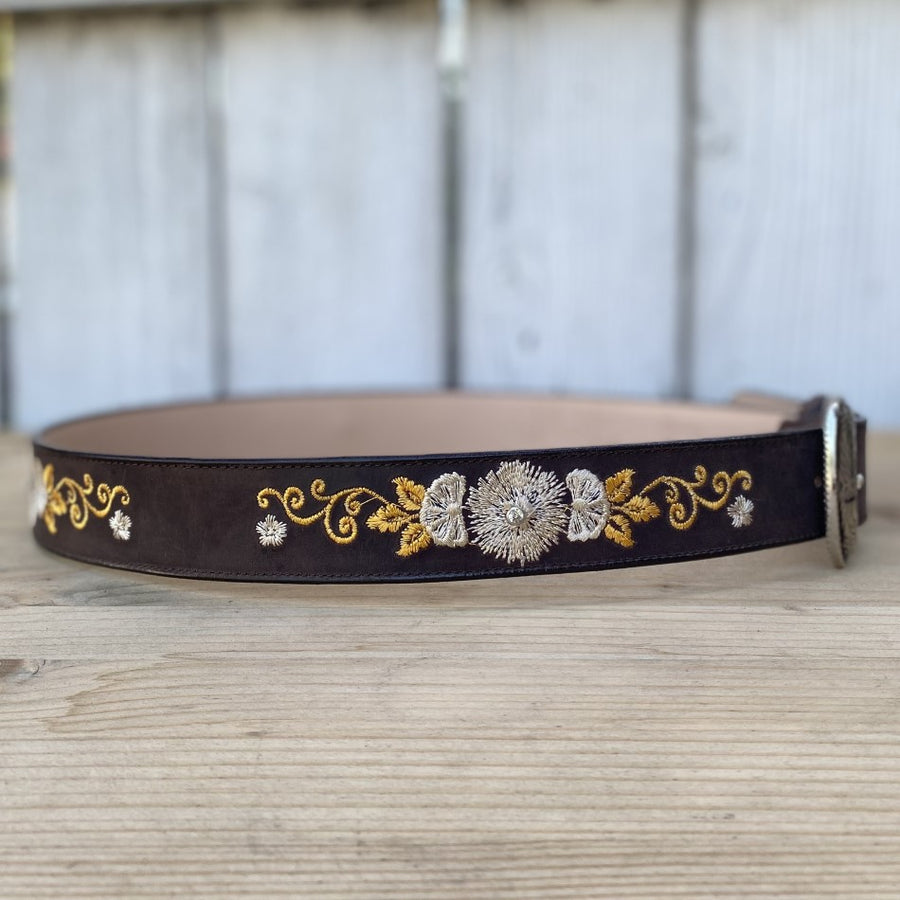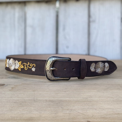 Descubre la distinción artesanal con nuestros Cinturones Bordados, meticulosamente elaborados en México con pasión y destreza. Hechos con piel de primera calidad en un llamativo tono chocolate con detalles en amarillo, estos cinturones presentan un diseño de bordado único de flores entrelazadas con garigoleos. Cada detalle refleja la rica tradición y el arte mexicano, agregando un toque de estilo y autenticidad a tu atuendo.