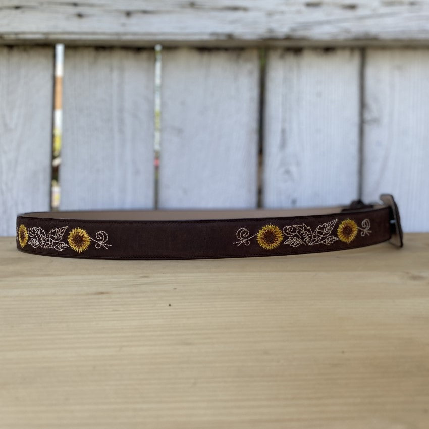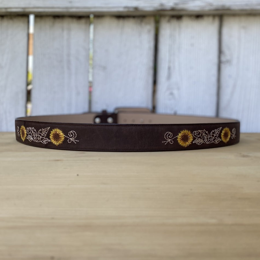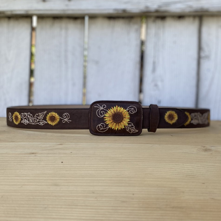 Este es el cinturón vaquero estilo JB-1505. Con su color chocolate y bordado vistoso de un girasol, este cinturón de piel 100% genuina capta la esencia del campo. Tiene 1 1/2" de ancho y cuenta con cinco filas de agujeros que permiten un ajuste cómodo. La hebilla con un solo pasador le da un toque clásico. Hecho en México, este cinturón es perfecto para quien quiere llevar un pedacito de tradición y naturaleza a donde vaya.