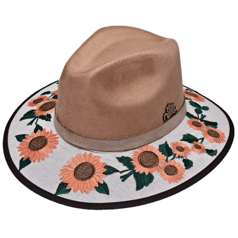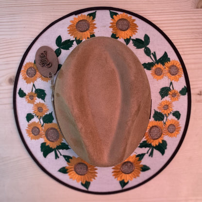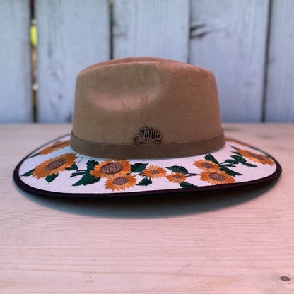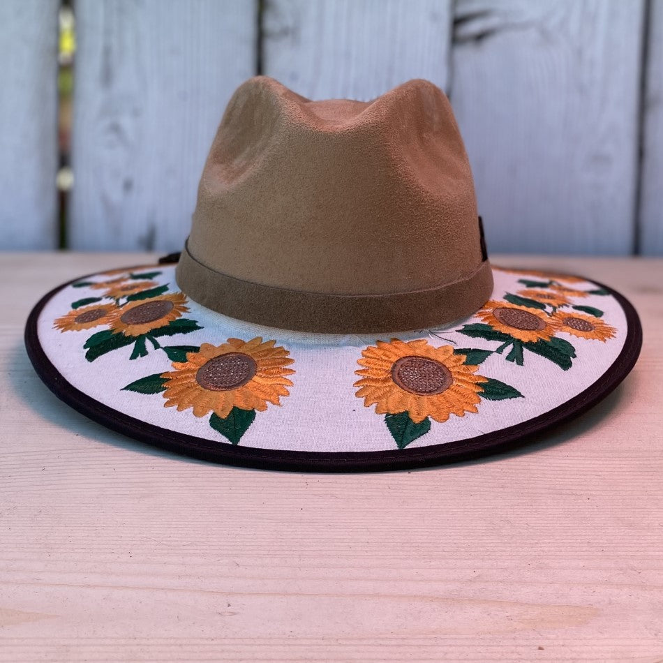 Sombrero de fieltro para mujer de Stone Hats. Hermoso material de fieltro marron en la copa de el sombrero con girasoles felices bordados rodeando la falda de el sombrero.