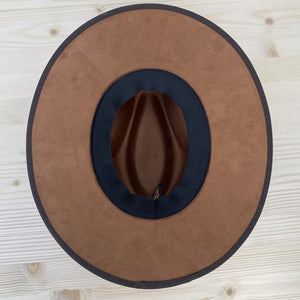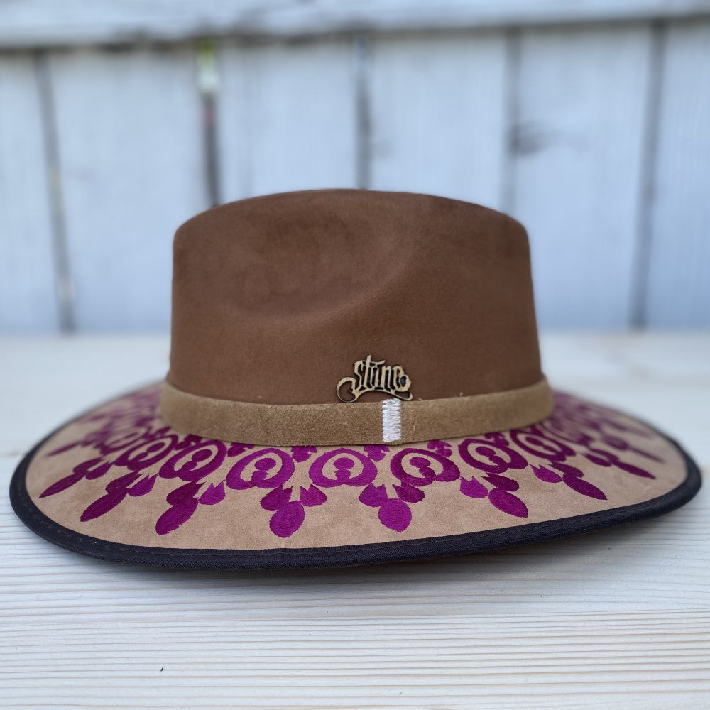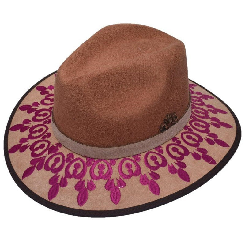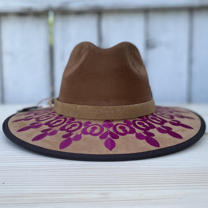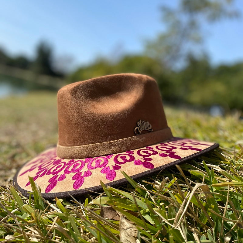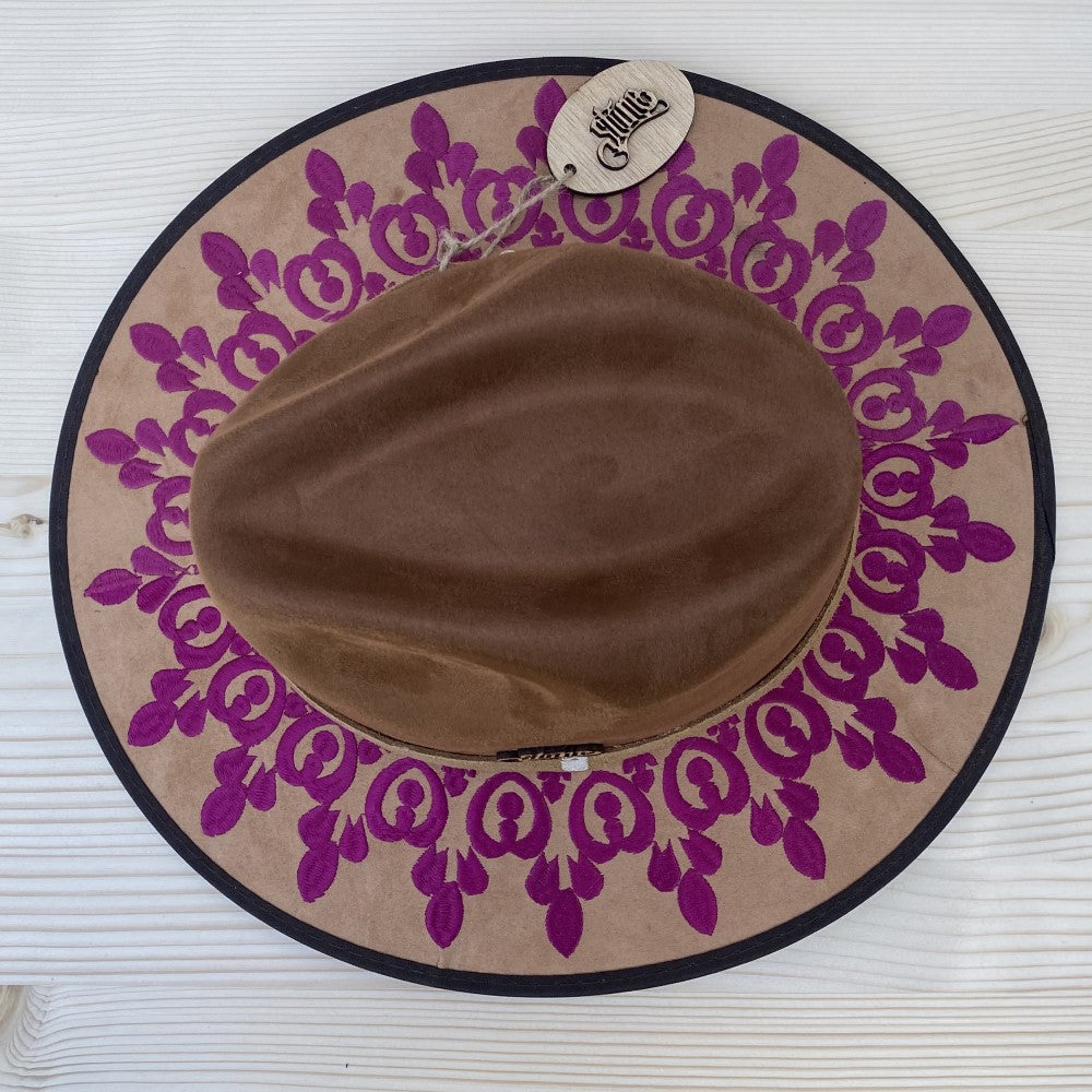 Sombrero de fieltro para mujer de Stone Hats. Hermoso material de fieltro color camel en la copa de el sombrero con un patron encantador color rosa bordado rodeando la falda de el sombrero.