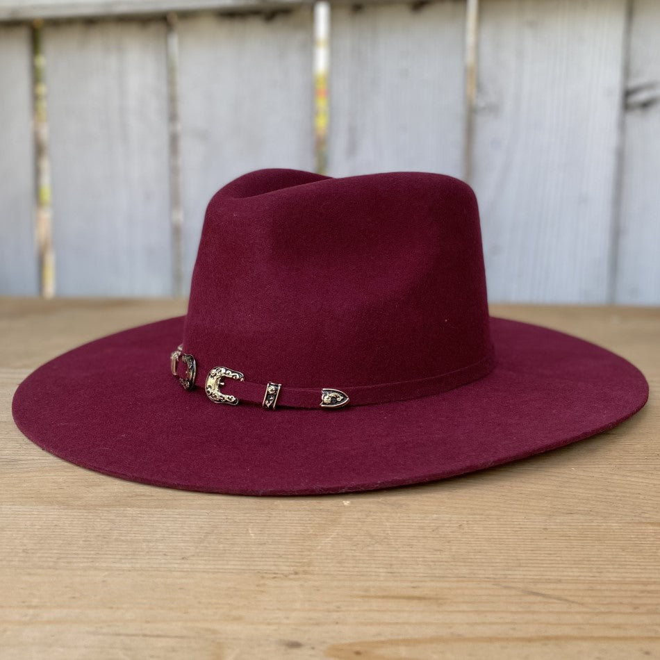 Sombrero fedora para mujer en color vino de Stone Hats. El sombrero está hecho de lana premium100X. Fedora también tiene dos hebillas de metal que rodean la copa del sombrero. Hecho 100% en México.