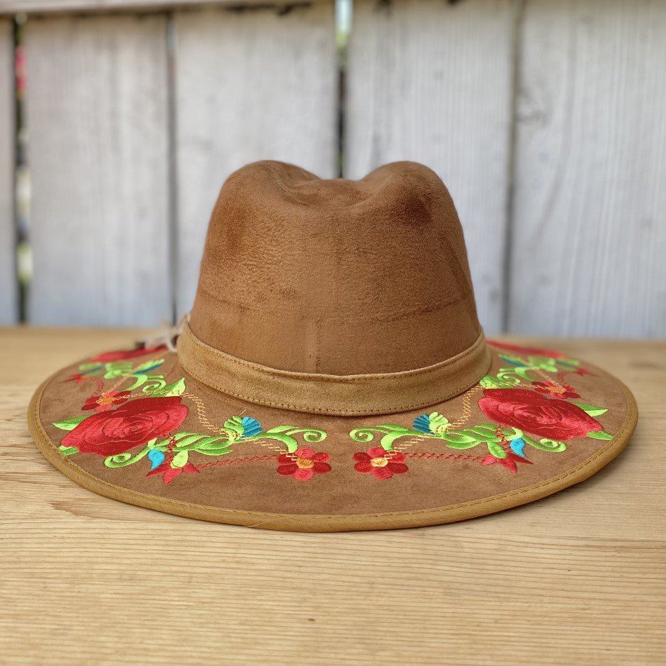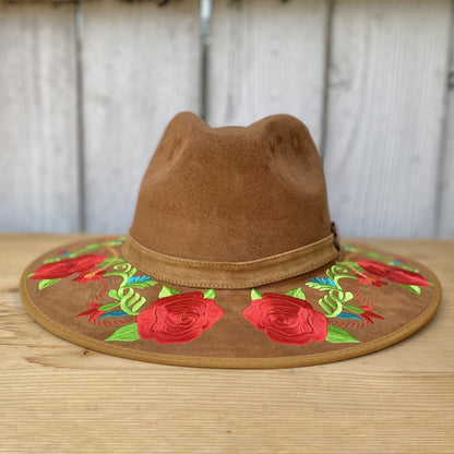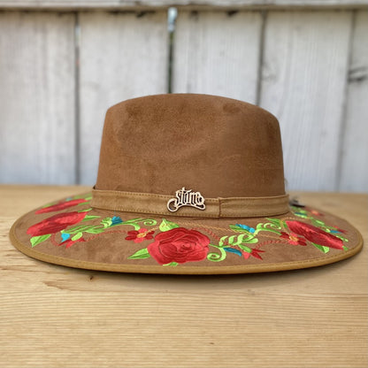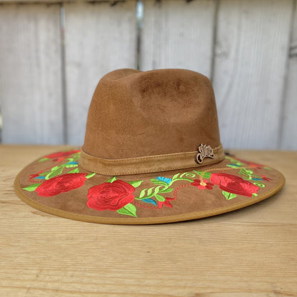 Sombrero de fieltro para mujer de Stone Hats. Hermoso material de fieltro tan en la copa de el sombrero con rosas bordadas que rodean la falda de el sombrero. Hecho 100% en Mexico.