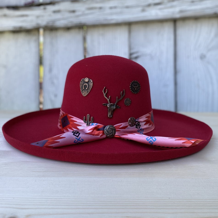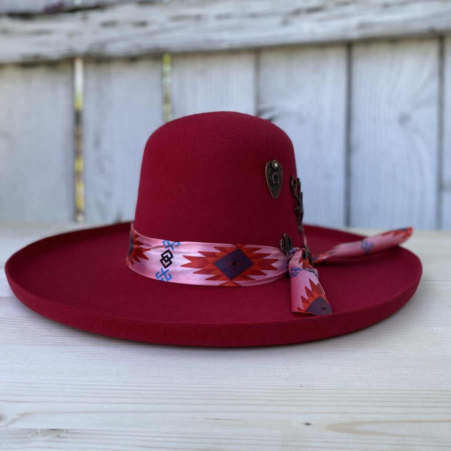 Este es el estilo Sombrero Open Crown con Herraje en color rojo de la marca Stone Hats. Su diseño vaquero para mujer destaca por la copa redonda, una toquilla con estampado étnico y herrajes metálicos decorativos que le dan un toque único y llamativo. Ideal para complementar un look western con personalidad.